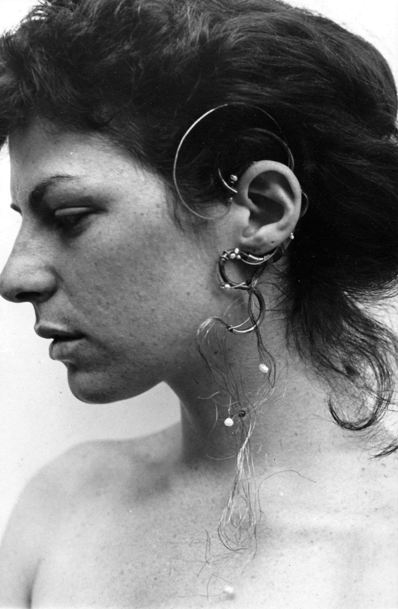 עגיל מעל האוזן עם תנועה. נחושת, פליז-זהב, אלפקה-כסף, חרוזים מאבני חן. עבודת יד. בצלאל 1978